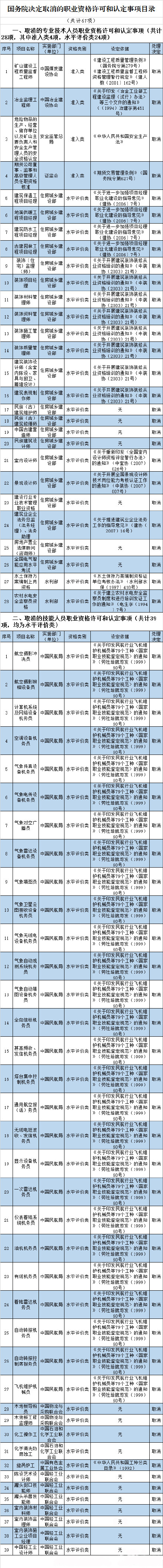 河南省教育網(wǎng)訊,近日國務(wù)院發(fā)布國發(fā)國發(fā)〔2015〕11號國務(wù)院關(guān)于取消和調(diào)整一批行政審批項(xiàng)目等事項(xiàng)的決定。文件說,經(jīng)研究論證,國務(wù)院決定,取消和下放90項(xiàng)行政審批項(xiàng)目,取消67項(xiàng)職業(yè)資格許可和認(rèn)定事項(xiàng),取消10項(xiàng)評比達(dá)標(biāo)表彰項(xiàng)目,將21項(xiàng)工商登記前置審批事項(xiàng)改為后置審批,保留34項(xiàng)工商登記前置審批事項(xiàng)。同時(shí),建議取消和下放18項(xiàng)依據(jù)有關(guān)法律設(shè)立的行政審批和職業(yè)資格許可認(rèn)定事項(xiàng),將5項(xiàng)依據(jù)有關(guān)法律設(shè)立的工商登記前置審批事項(xiàng)改為后置審批,國務(wù)院將依照法定程序提請全國人民代表大會常務(wù)委員會修訂相關(guān)法律規(guī)定。其中取消的職業(yè)資格許可和認(rèn)定事項(xiàng),包括礦山建設(shè)工程質(zhì)量監(jiān)督工程師、冶金監(jiān)理工程師、建筑裝飾設(shè)計(jì)師、室內(nèi)設(shè)計(jì)師、景觀設(shè)計(jì)師、氣象填圖員、化工操作工、中國輕工業(yè)設(shè)計(jì)師等。如下圖所示:圖片來自網(wǎng)絡(luò)。
